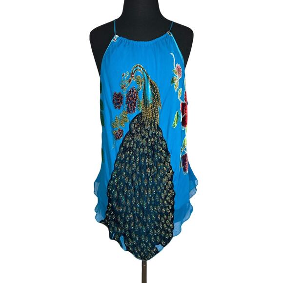 Stunning halter tank top featuring an embellished vibrant peacock design with vibrant floral velvet accents.