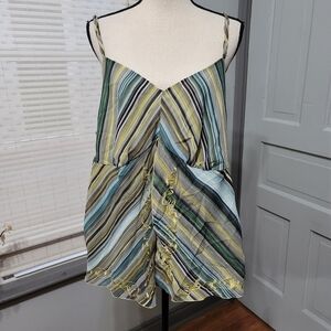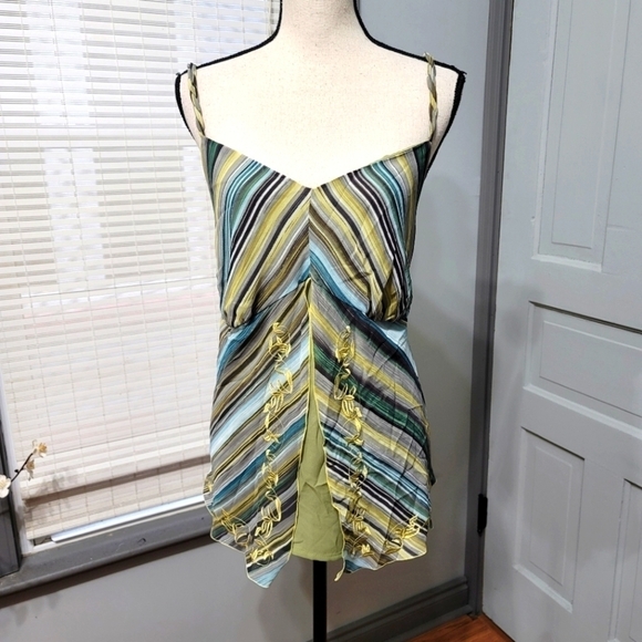 this whimsical Cami is so pretty you can't help but look at it. with the straight colors that bleed together with strips of metallic gold and the embroidered floral pattern it just makes it pop