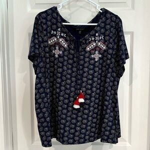 Lane Bryant Embroidered Tassel Tie Boho Blouse Plus Size 18/20 Short Sleeve Peasant Navy White Red Split Neck Cotton Modal
