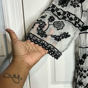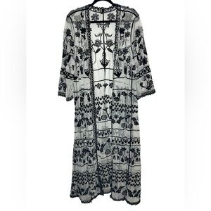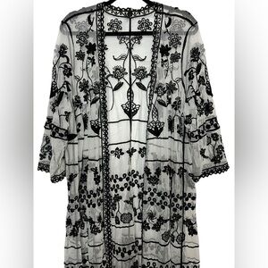 It features an open front, 3/4 sleeves, scalloped-edge trim, and embroidered mesh. The longer tunic length is ideal for extra coverage when paired with skinny jeans or leggings. Preloved.