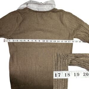 Faux layered long sleeve top from Lane Bryant in Beige. It has a white collared shirt insert that gives the appearance of wearing a sweater over a shirt. V opening reveals the shirt insert, creating a layered look. Classic, preppy layered look without the bulk or hassle of wearing two separate pieces. Size 14/16