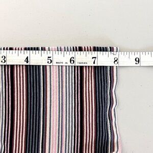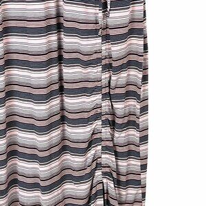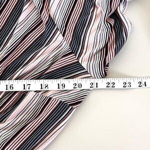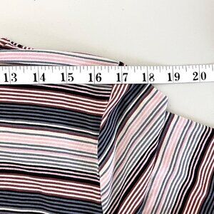 This striped maxi dress offers a flattering faux wrap silhouette with a tie detail at the waist and ruching on the bottom. Soft rayon-spandex fabric ensures comfort and style. Small horizontal stripes in pink, gray, blue, and black. In very good pre-owned condition.