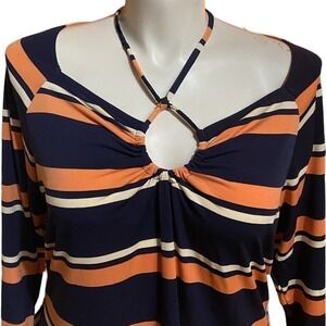 A flirty fitted top with an alluring keyhole and strap detail at the square neck in striped ribbed knit.