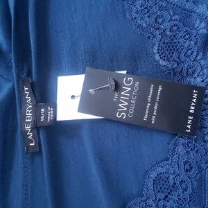 Lane Bryant Flattering Silhouette Swing Top Size 14/16 New with tags! this top is a turquoise color. It has 3/4 sleeves and and a soft v neck that is lined in lace. It also has a lace shark bite hem at the bottom. Pit to pit measures approximately 21". Top to bottom measures approximately 31". Sleeve length measures 19".
