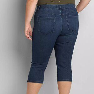 Lane Bryant Flex Magic Waistband Mid Rise Pedal Capris in Signature Fit - dark wash blue denim jeans in capri length. Meet your new go-to! This versatile pair of Signature Fit pedal jeans boasts a classic dark wash packed with plenty of dress-up-or-down potential. Fading and whiskering detail. Belt loops. Five pockets. Button and zip-fly closure. Flex Magic Waistband. The no-gap, stretch waistband that moves with you for all-day comfort. FIT: Signature. Our most popular fit for those who are proportional from waist through the hip and thigh. LEG SHAPE: Pedal. Super slim from hip to just below the knee.