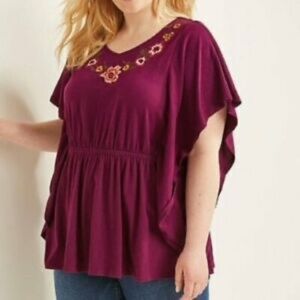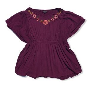 Lane Bryant women's short sleeve top in berry purple crepe with a gorgeous, floral, embroidered V neckline. Dolman sleeves with exposed batwing sides give this a flattering and flowing look. Pair with jeans or a shirt of that boho-chic style. Machine washable.