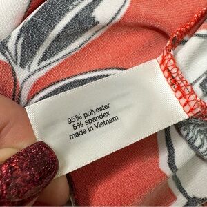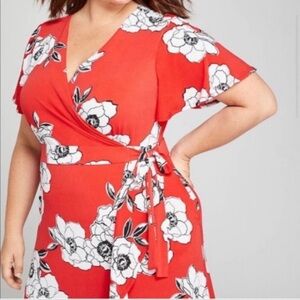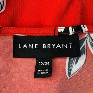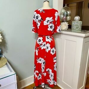 Lane Bryant Floral Faux Wrap Maxi Dress in a Red & White Flower Print. Ties at the side. Short sleeves. Hi, low ruffled hem. Stretchy. Like new. Size 22/24.