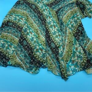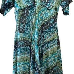 The Lane Bryant Floral V-Neck Faux Wrap Midi Dress in vibrant green blue colors is a stylish and piece perfect for various occasions such as parties, casual outings, and business events. This short sleeve dress features a flattering V-neckline, ruffle accents on sleeves and hem in a colorful floral pattern. The dress is designed with an empire waist and a pullover closure for easy wear. With its A-Line silhouette and wrap dress style, this midi-length dress exudes a bohemian and colorful theme as it moves beautifully with you.