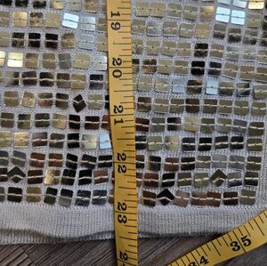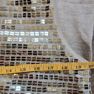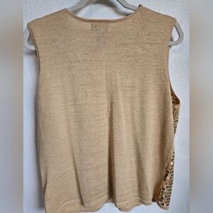 vtg The Women's Sleeveless Sequin Knit Top in size 14/16 from Venezia Jeans Clothing Co. is a stylish and elegant piece for any woman's wardrobe. Made with a knit blend material and embellished with sequins, this top exudes a vintage charm with a touch of glamour. The V-neckline adds a sophisticated touch, making it perfect for both casual and dressy occasions. The gold color adds a luxurious and eye-catching element to the overall design, making it a versatile piece that can be styled in various ways for different looks.