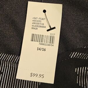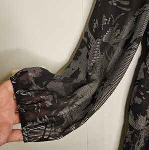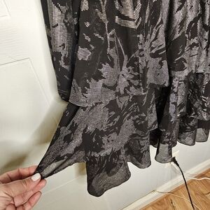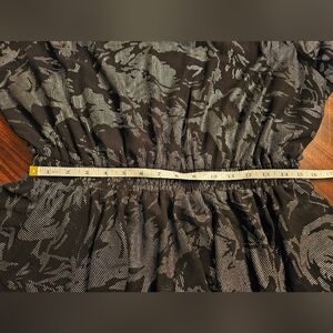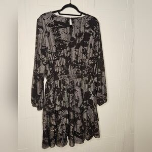 Romantic graphic floral black and gray knee length skirt from Lane Bryant, new with tags on size 14/16. Has full fit and flare skirt which is fully lined and elastic waist. Long sleeves woth elastic cuffs and boat neck with back button closure. The skirt is tiered.