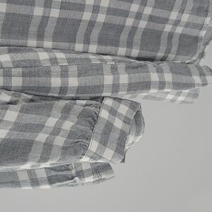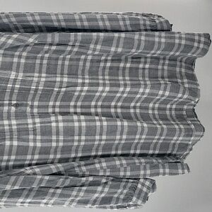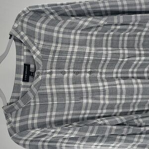 Chic gray checkered shirt with button-up and pleated design. Ideal for everyday style. Can't see in the pics, but has silver shiny/glitter detail. Very pretty!! Gently worn and in excellent condition!!