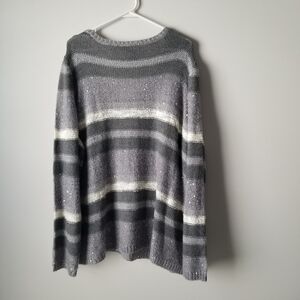 Gently used Lane Bryant Stripped Color block knit sweater in a size 26/28. Colors are gray and cream with sequins sewn throughout.