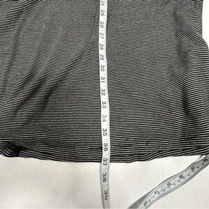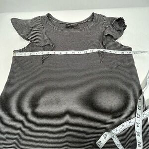Stylish gray striped midi dress. Features flutter sleeves. Comfortable fit.