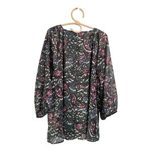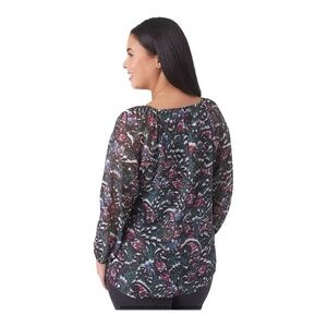 Beautiful Lane Bryant blouse in size 22 featuring a flowy boho-chic silhouette and multicolor paisley-style print. Sheer long sleeves, sweetheart V-neckline, and lined body for comfort and coverage.