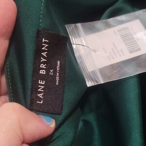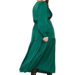 Embrace elegance with the Lane Bryant Green satin tiered maxi Dress, perfect for wedding guest occasions. This stunning piece features a flattering V-neck line and long sleeves, NOTE TIE BELT MISSING. does not need one, or you can add a black belt of your own. The dress adds a touch of sophistication, making it a standout choice for any cocktail event.Tiers of smooth satin + an ethereal maxi length + must-have hues = a dress that will turn heads all season long.