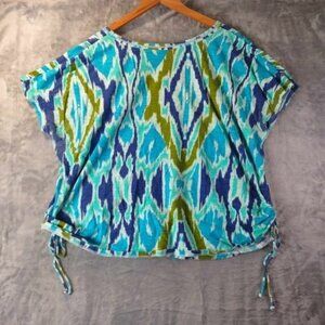 Lane Bryant Ikat Green & Blue Print Cotton Top Drawstring Hem 18/20 100% Cotton
