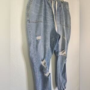 A comfy-cool boyfriend jogger with attitude (thanks to the ripped and distressed denim). Fading and whiskering. Covered elastic drawstring waistband. Four pockets. Banded cuffs.