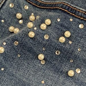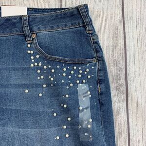 Medium Wash Denim shorts. Mid Rise Girlfriend style. Cuffed. Essential Stretch. Pearl and rhinestone embellished design on the front.