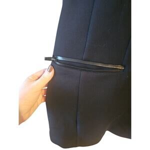 Peak lapel collar. Long sleeves with functional button closures. Single welt chest pocket. Zipper pockets. Princess seams. Center back vent. Super smooth scuba fabric. Button closure at front.