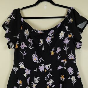 NWT Lane Bryant Lena Flutter Sleeve Black Floral Jumpsuit. This feminine jumpsuit features a banded elastic neckline that can be worn on or off the shoulders, wide legs, short flutter sleeves, on seam pockets, a set in waist with princess seams and a hidden zipper in the back. Size 16.