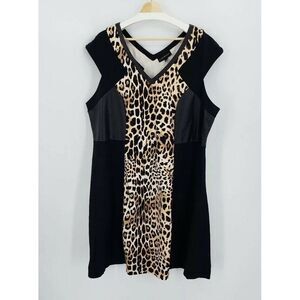 Lane Bryant Black Leopard Print Double V Neck Stretch Knit Faux Leather Dress