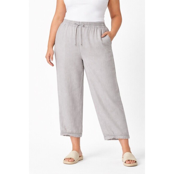 Lane Bryant light gray linen blend pull on elastic waist wide leg pants , has a kina crochet detail at the hem