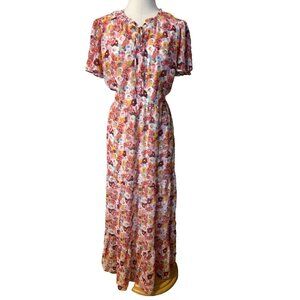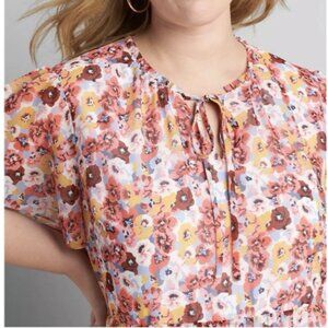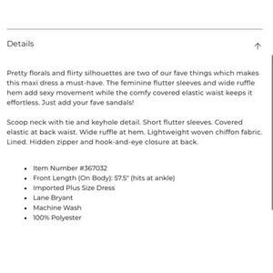 This pretty dress is from Lane Bryant in a misses size 14/16. Colorful florals over an ivory base. Fully lined, made of polyester. Machine washable. Pullover style with stretch. Has a smooth fit with back zipper. Tiered skirt. Flutter sheer sleeves. Ruffled trim around the neckline. Keyhole front with fabric string tie.