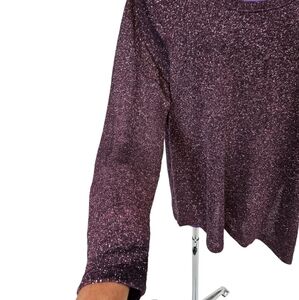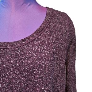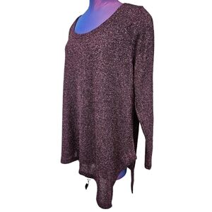 Features lightweight merlot color with metallic speckles, tight knit asymmetric blouse, tunic length, long casual sleeve, scoop neck, side slit, flowy top, silver sparkle accents.