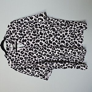 Inverted triangle cutout at the neck. White with black splotch pattern all over. I wouldn't necessarily call it an animal print. Large flutter sleeves. 2 button closure behind the neck with a keyhole opening. Fabric does stretch. Great condition. Camp, summer, statement, bold, colorful, wild, brunch, dinner, date night, office, workplace, going out, maximalism, curvy, plus, cute, fun, feminine