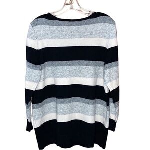 New with tags. Super soft striped v-neck sweater from Lane Bryant. Horizontal stripes in black, white and gray tones. Ribbed knit sleeve cuffs and hem. Brushed 90% polyester/10% nylon. Machine wash dry flat.