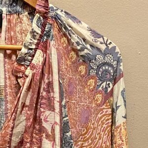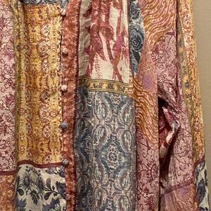 This vibrant top by Lane Bryant features a multi color patchwork design with a gathered elastic neckline, button down and billowy dolman sleeves.