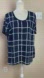 Lane Bryant Navy & White Blue Windowpane Plaid Print Blouse. Polyester. Machine wash. Short sleeves. Round collar. Frayed trim at collar and sleeves. Slightly longer in back.