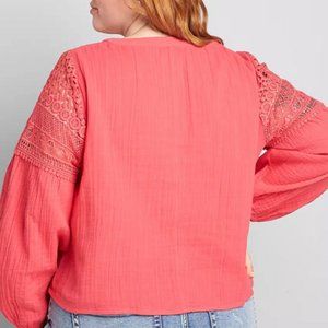 From the pretty crochet and button-front detail to the slightly-textured fabric, this top is perfect when you're just not sure what the weather's doing. The cropped length means you can show off your fave high-waisted jeans. Please note color looks more pink then stock photos.
