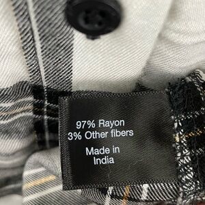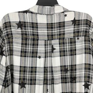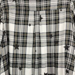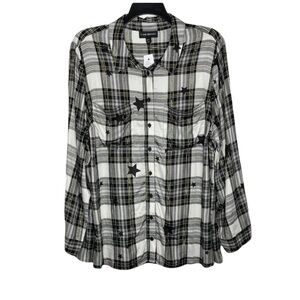 Lane Bryant No-Peek Button-Front Plaid Star Print Top Shirt. In a black and white/off white plaid with gold metallic detail. Black stars throughout. Button front. Long sleeves with button cuffs. Collared. Chest pockets. Soft, lightweight material.