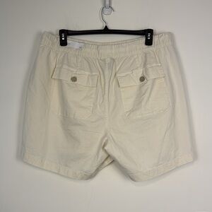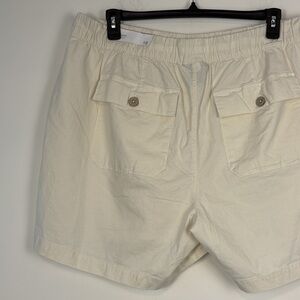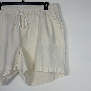 Lane Bryant Off White Linen Blend Mid Rise Shorts. Size 18. New with tags. In great condition. There is a small spot on the back of the left hem. Pull on style with drawstring. Pockets. Loose and relaxing. Waist measures 38 inches. Rise 12 inches. Inseam 5 inches. Comes from a smoke free home. They are labeled mid rise but are high rise.