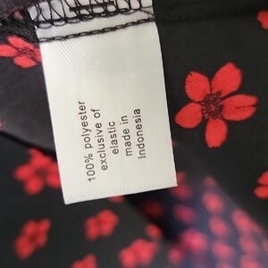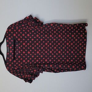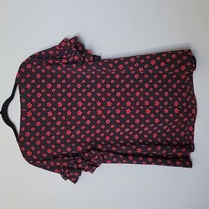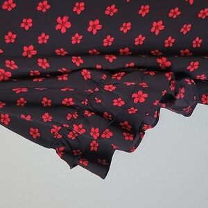 Black with small red florals all over. Ruffles at the sleeves. Short sleeves. Great condition. Thin, lightweight fabric, does minimally stretch. Great for the office or to wear casually. career, workplace, whimsical, girly, sweet twee, romantic, curvy, plus, brunch, church, botanical, garden, dainty, frilly, colorful