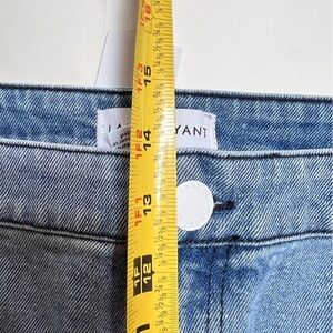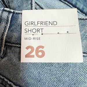 Lane Bryant Flex Magic Waistband Mid Rise Girlfriend Shorts. Dip dyed ombré fades from blue to white. Button and zip fly closure. Classic five pocket styling. Raw fringed hem. Mid rise.