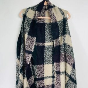 Super soft! One size. Has the fringe along the hem. Sleeveless blanket style cardigan. Great for layering and paired with boots!