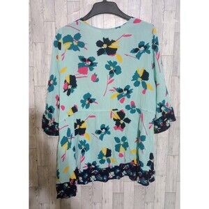The Lane Bryant blue floral tie waist cover up is a stylish and comfortable overpiece perfect for casual occasions. Made from rayon, this V-neck blouse features a relaxed fit with a tie front closure and kimono sleeves. The beautiful floral pattern adds a touch of femininity, while the 3/4 sleeves and machine washable fabric make it practical and easy to style. Whether you're looking to add a pop of color to your outfit or cover up at the beach, this overpiece is a versatile and chic choice.