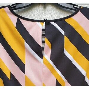 This beautiful Lane Bryant dress is a full-length woman's size 16. It is sleeveless with a removable belt tie accent. Its multicolored in a striped pattern. It's a round neck but has a v cutout and it buttons in the back. The pit-to-pit measurement is 22" across, 44" around. From the top to bottom measures 56". It's the perfect fall dress for any occasion!