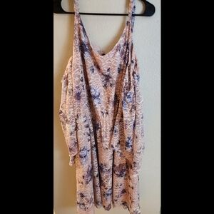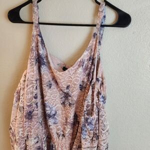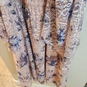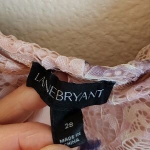 Lane Bryant lace dress. Has a cold shoulder with bell sleeves. Delicate pink floral lace overlay with high low tiered skirt. Midi length. Elastic waist. Adjustable spaghetti straps.