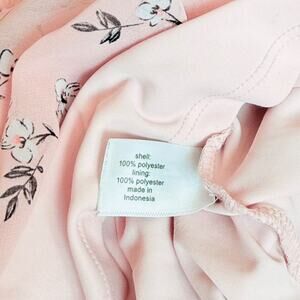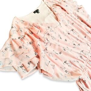 • Brief description: Feminine Pink chiffon blouse with overall floral print, exaggerated layered ruffle sleeve v-neck, flutter sleeves, elastic faux drawstring waist to create a peplum style. Polyester shell and lining. Machine washable.