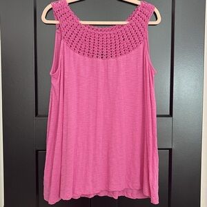 Lane Bryant (Plus Size) Pink Sleeveless Top w/Crochet Neckline. 100% Cotton. Size 14/16. Chic and comfortable pink sleeveless top with a stylish crochet neckline. Perfect for casual outings this spring/summer. This color of pink is quite a pop if bold color. Tank Top swings out a bit at the bottom for a comfortable fit.