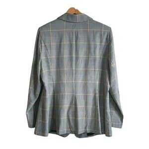 This Lane Bryant Plaid Double Breasted Blazer is a stylish and professional jacket for women in size 18. Made of polyester with a classic plaid pattern, it features long sleeves and a mid-length design with a button closure. Suitable for various occasions such as parties, work, or business settings, this blazer exudes a career-oriented, classic, and preppy style. The gray color and accent buttons add a touch of sophistication, making it a versatile piece for year-round wear.