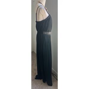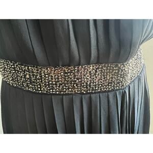 Beautiful chiffon pleats with sequins at waist. Fully lined to knees. Removable adjustable straps to turn it into a strapless jumpsuit if you so desire. Side zip entry. Beautiful gold beeds in front at waist, elastic waist.