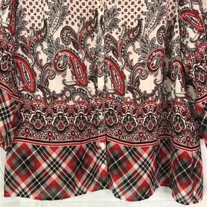 Three quarter sleeve, V neckline, paisley print, pattern, beaded accents, gray, boho, tunic top