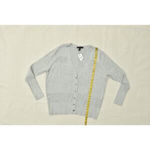 This is a brand new with tags Lane Bryant women's cardigan sweater. The sweater is a light gray color and features a v-neckline, long sleeves with an intricate ribbed and perforated pattern. It is a plus-size 18/20 and has a full button-up closure. The material is a comfortable blend of 72% rayon and 28% nylon, providing a soft and stretchy feel. This versatile cardigan is perfect for layering over a variety of outfits for any occasion. The item is in new condition with original tags still attached. Measurements are approximately 25 inches armpit to armpit and 25 inches in length from the shoulder to the hem.