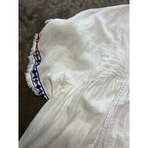 The Lane Bryant Plus Size 18/20 Relaxed Flutter Sleeve Top with Blue Embroidery is a stylish and comfortable blouse suitable for casual occasions. Featuring a V-neckline, short flutter sleeves, and a pullover closure, this top offers a relaxed fit for size 18 plus size women. The geometric pattern with blue embroidery and tasseled accents adds a touch of bohemian flair to the white blouse, making it a versatile piece for summer, fall, and spring seasons. Made from a blend of polyester and cotton, this top is machine washable for easy care.