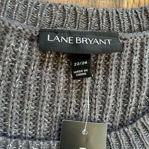 Lane Bryant women’s plus size sweater, new with tags, size 22/24. Gray knit body with silver metallic thread woven throughout for subtle shimmer. Features sheer crochet-style sleeves with delicate beaded accents. Pullover style, long sleeves, scoop neckline. Condition: Brand new with tags, no flaws noted.
