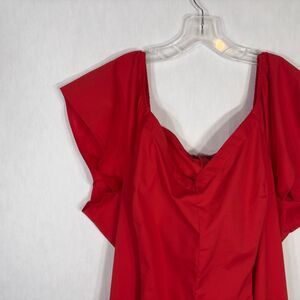 Wide V-neck. Short sleeves with elastic at neckline. Princess seams. Woven poplin fabric. Hidden back zipper with hook & eye closure. Slightly shorter length.